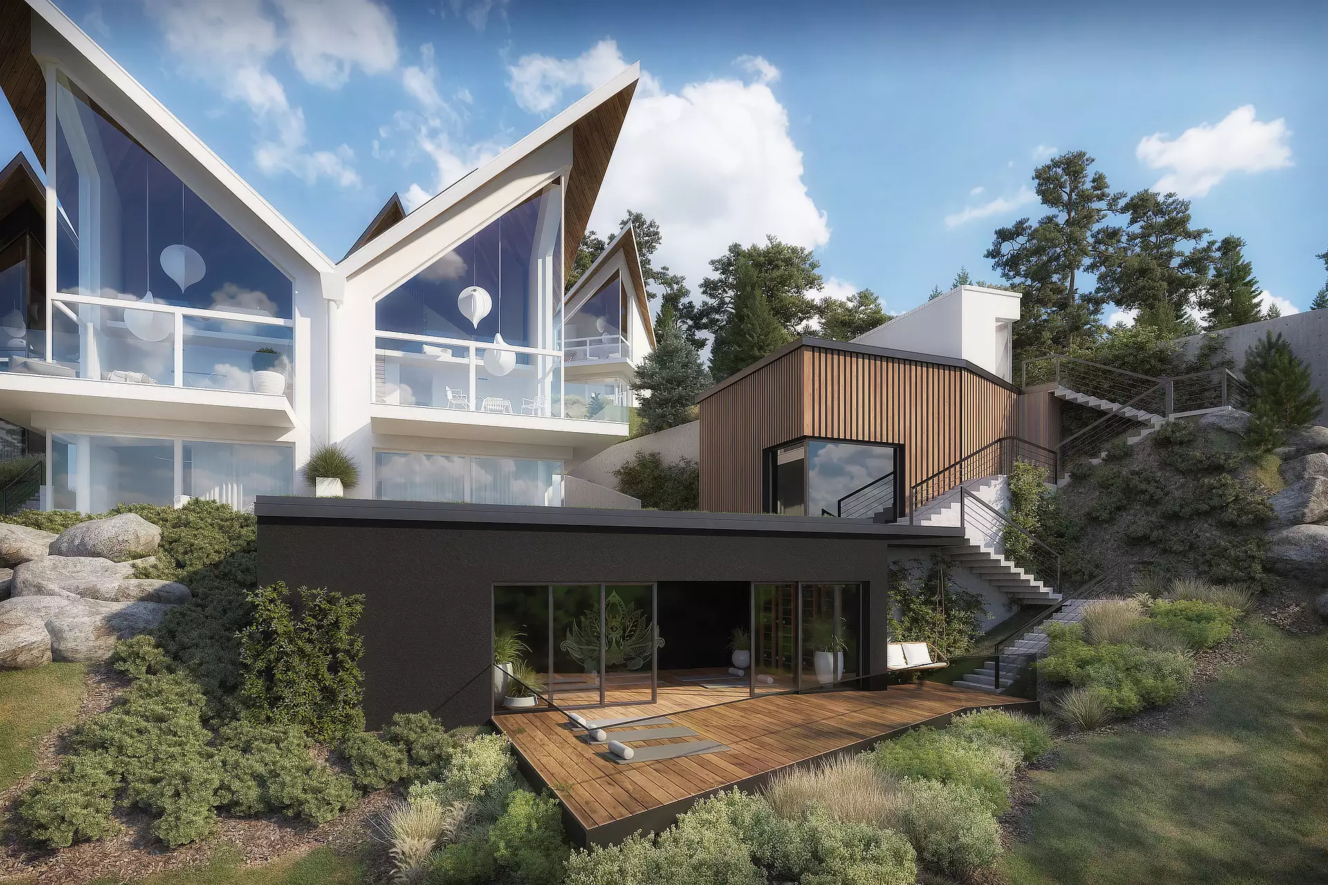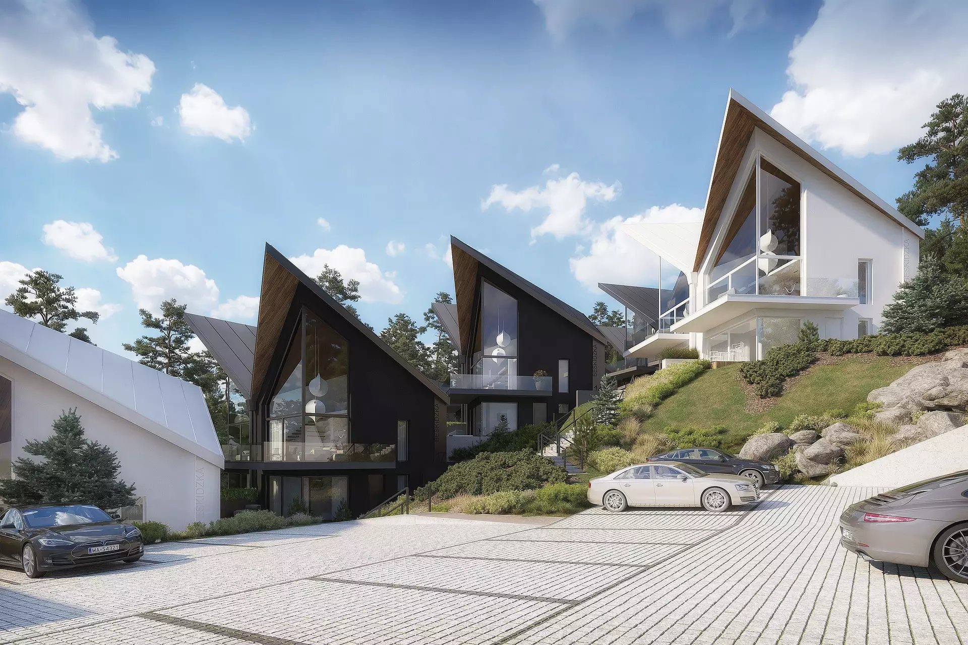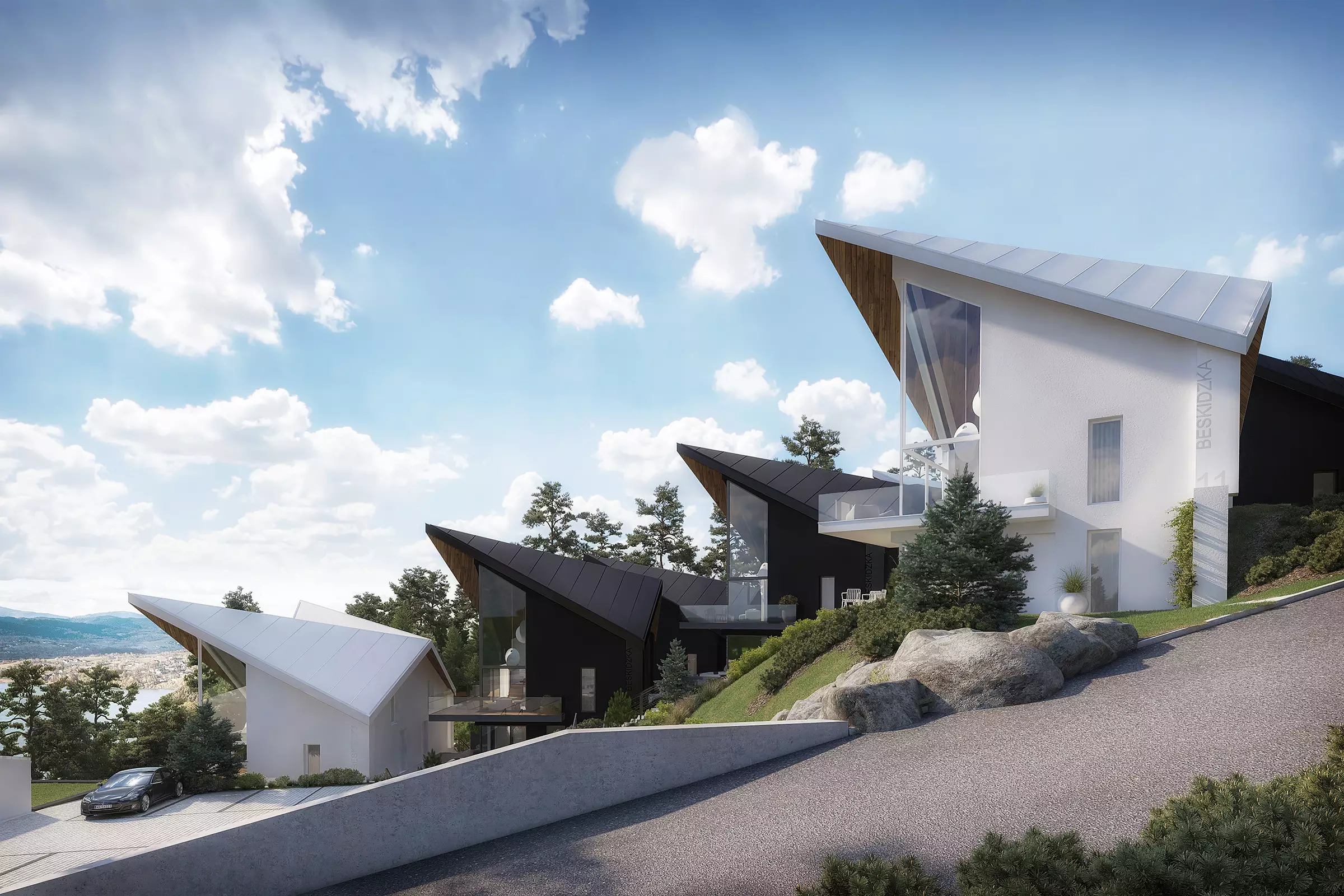 18 stylowych willi zostało zaprojektowanych przez renomowane studio architektoniczne tak, by wkomponować je w naturę, nadać charakterny rys, a dzięki odwróconej kalenicy móc cieszyć się słońcem przez większą część dnia.