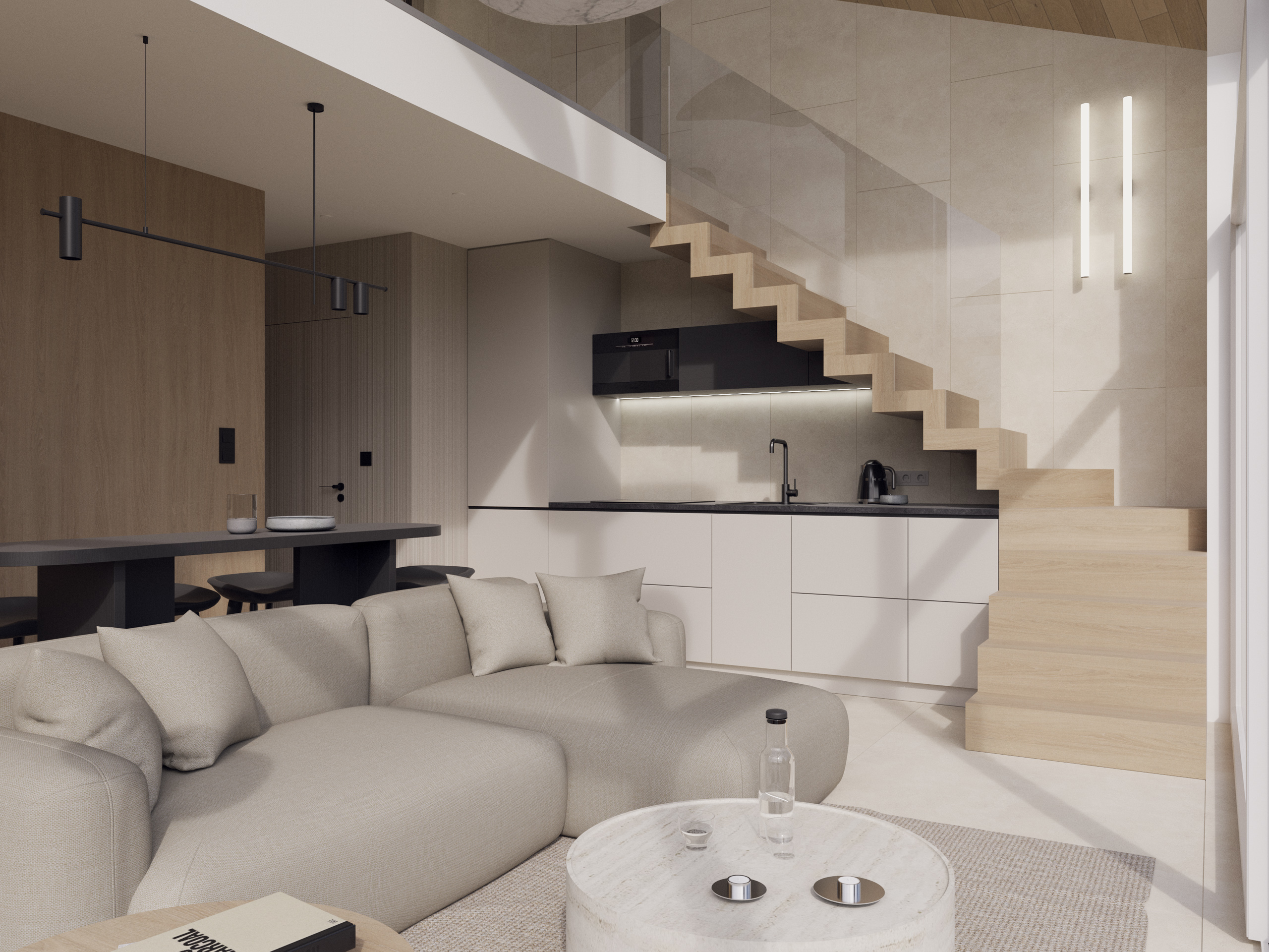 Szary świt korespondujący z naturą. Wnętrze w odcieniach szarości jest nowoczesne i minimalistyczne, łączy styl industrialny ze skandynawskim, a jednocześnie nawiązuje do przyrody dzięki użyciu naturalnych materiałów: drewna, kamienia i gresu.